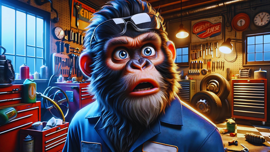 "Surprised Ape Mechanic Poster - Unique Cartoon-Style Art for Garage Decor"